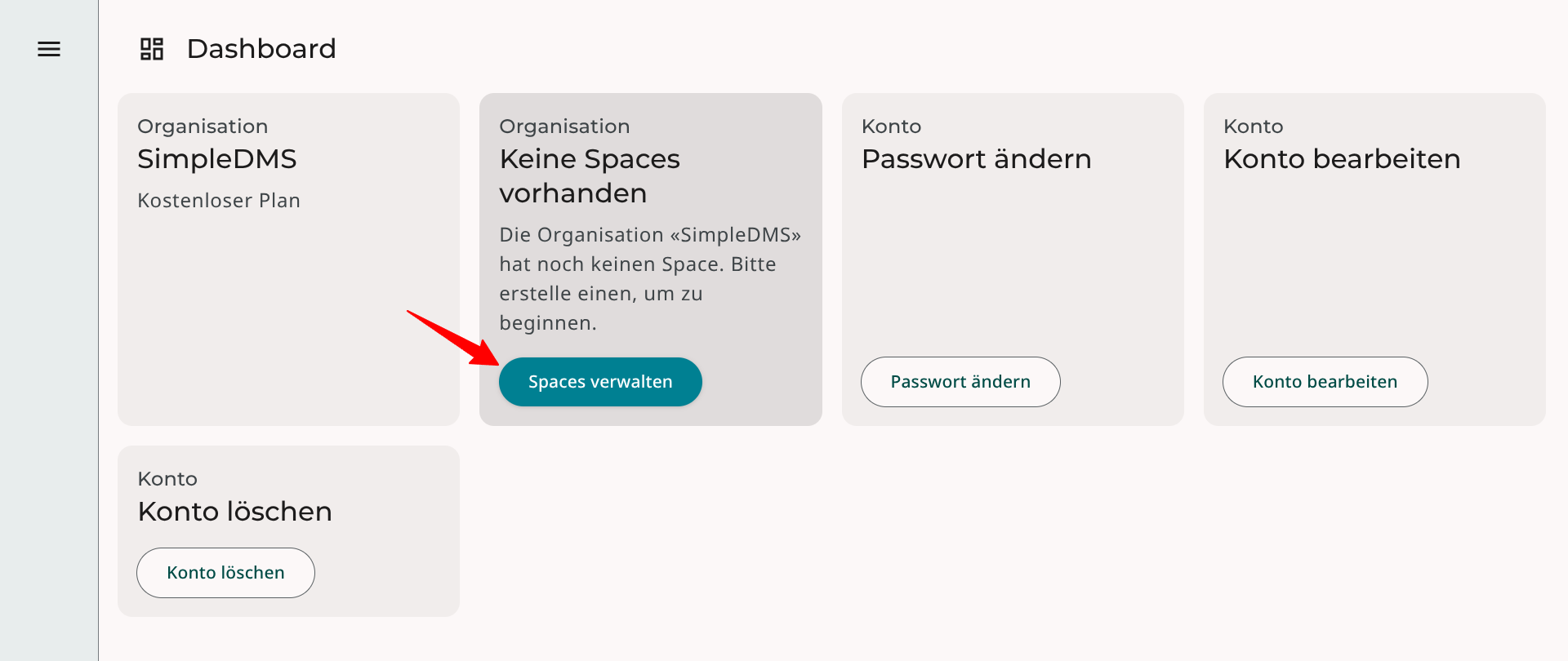 When you log in for the first time, SimpleDMS informs you on the dashboard that no space is yet available in the system and that you need to create one.