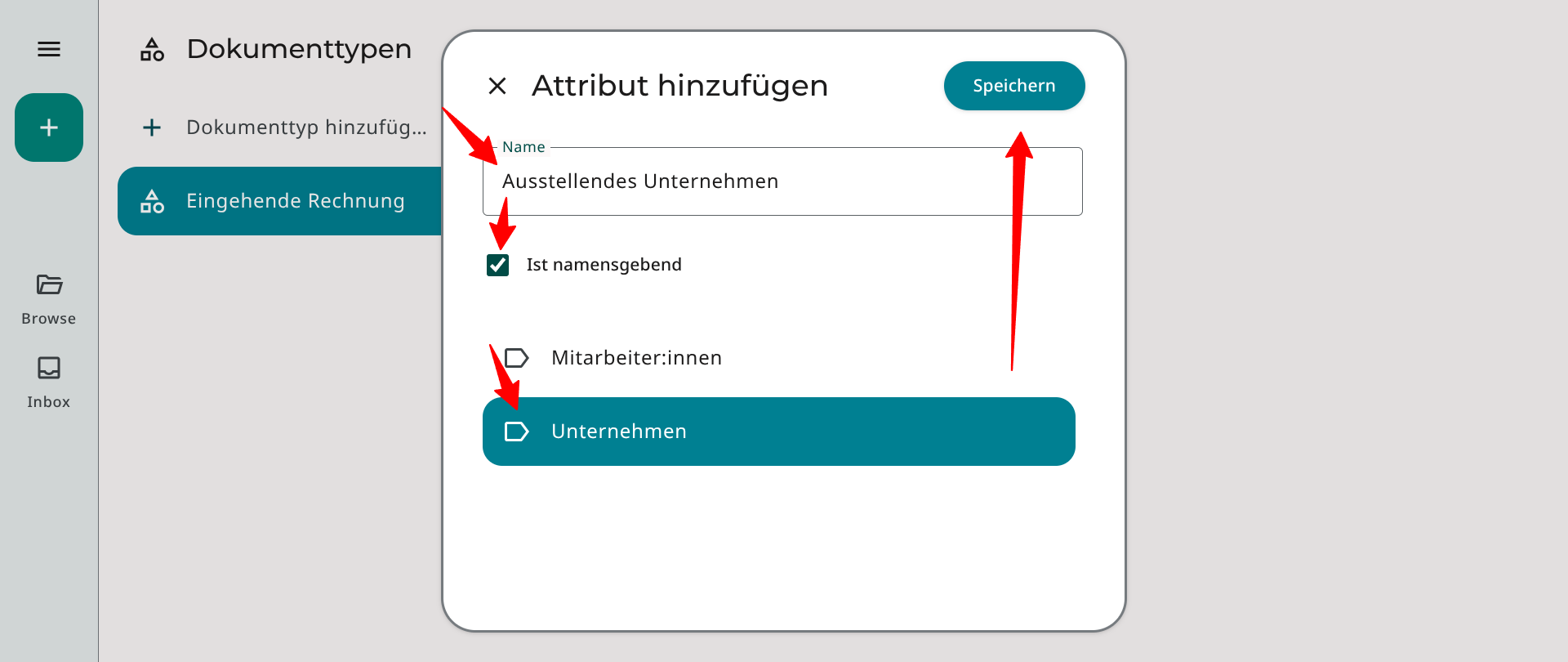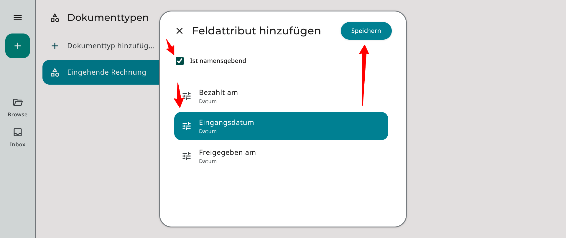 In the overview, you can now also see the effect of the «name-giving» attributes on the document's designation.