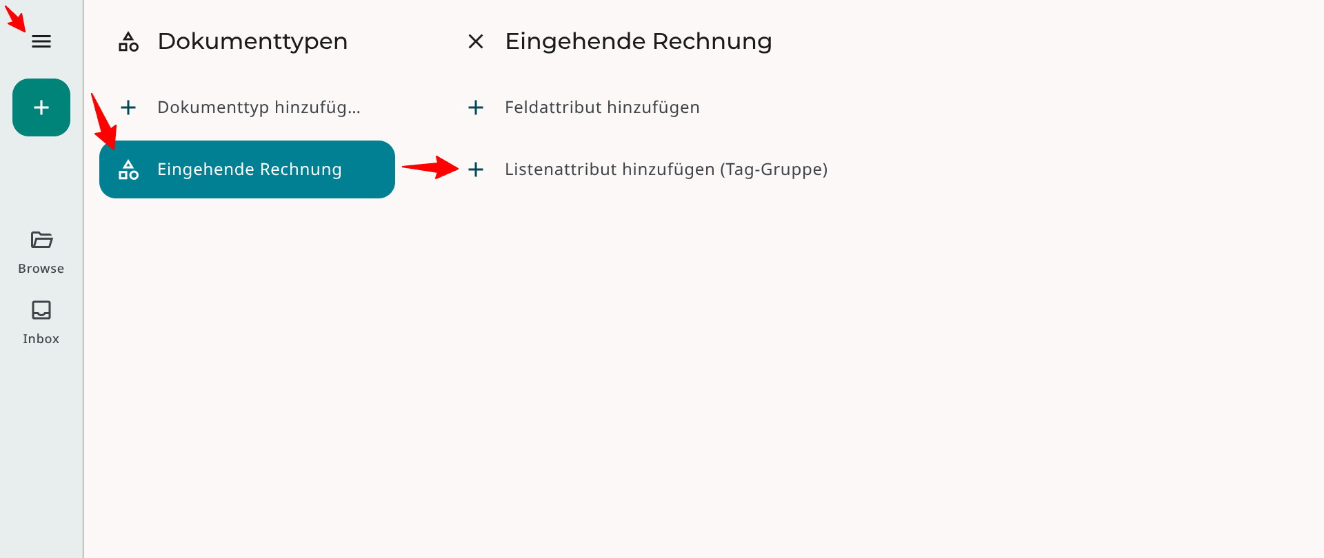 Afterwards, it is possible to add the tag groups as list attributes in the document type management («Document types» in the main menu).