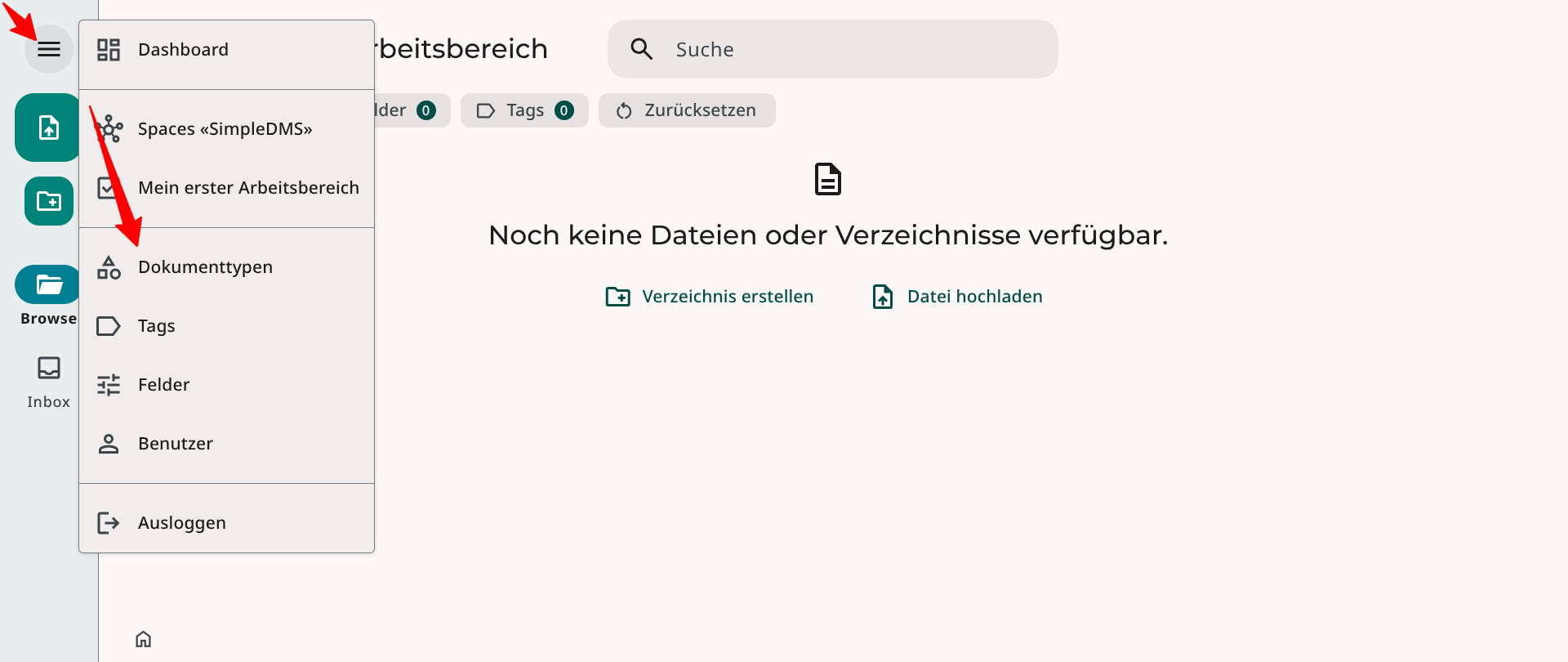 To do this, first select your newly created space and then switch to document type management via the menu.